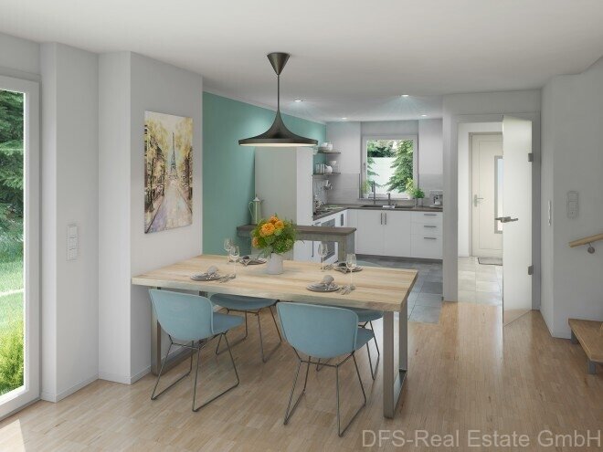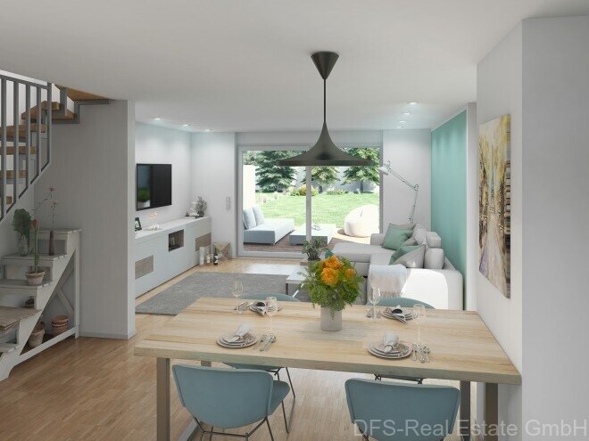 Das Erdgeschoss überzeugt mit einem offenen Wohn-, Ess- und Kochbereich, der direkt auf die Terrasse und in den Garten führt. Ergänzt wird es durch ein praktisches Gäste-WC. In den oberen Geschossen befinden sich Schlafzimmer, Arbeits- oder Kinderzimmer sowie ein hochwertig ausgestattetes Tageslichtbad mit Dusche und Badewanne. Zusätzlicher Stauraum steht im Dachgeschoss zur Verfügung.
