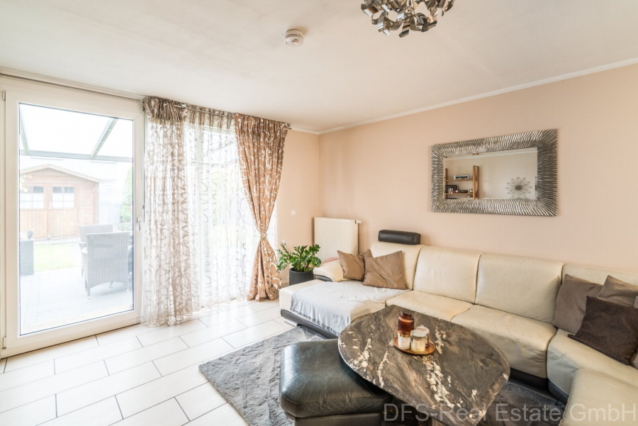 Vom Wohnzimmer aus gelangt man über die überdachte Terrasse in den wunderschönen Garten mit Gartenhäuschen und Außengrill.