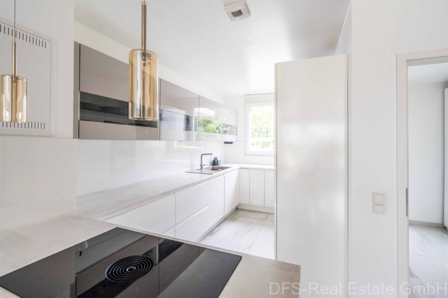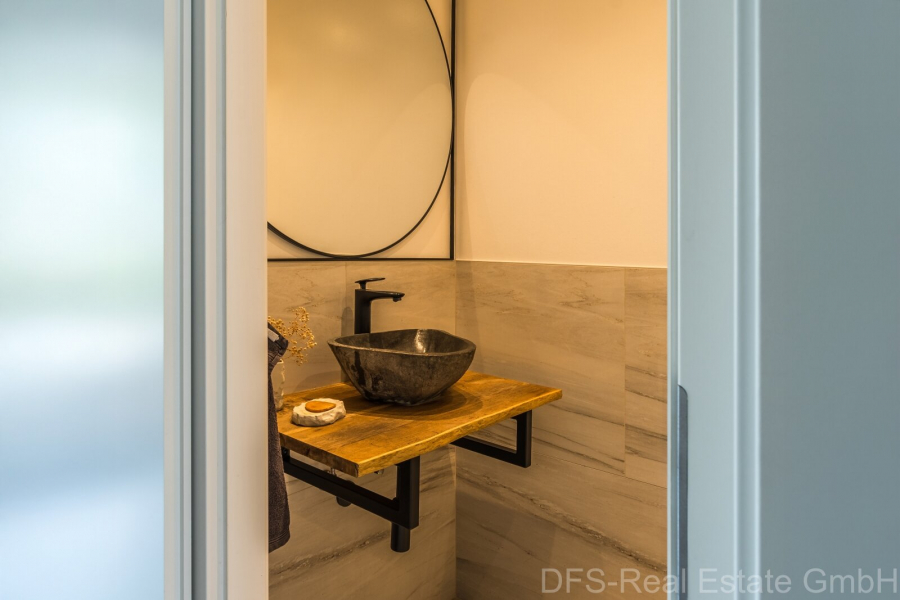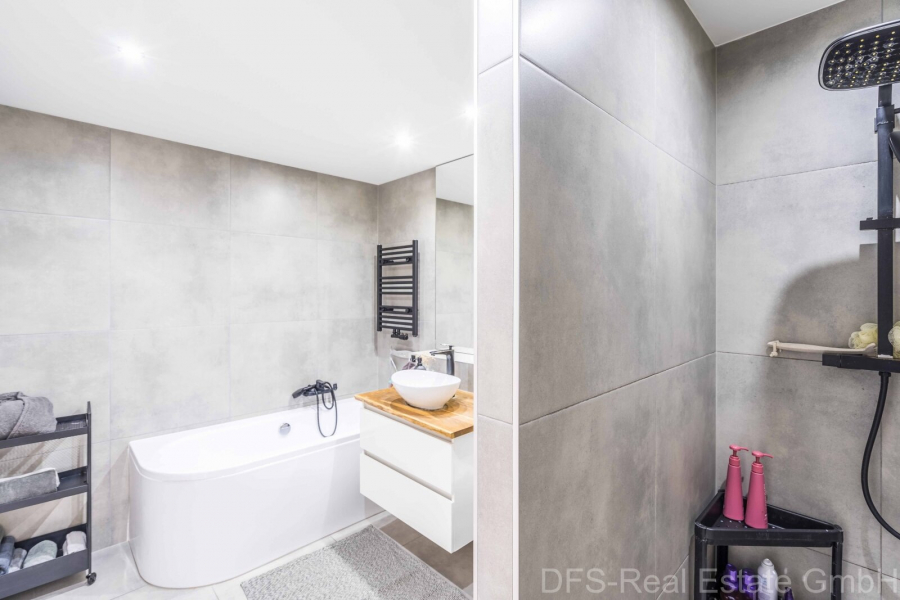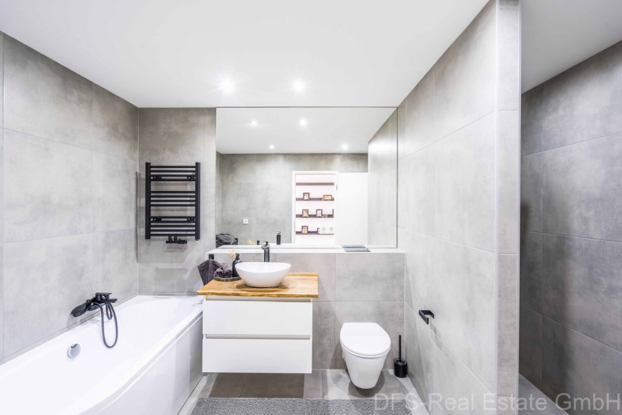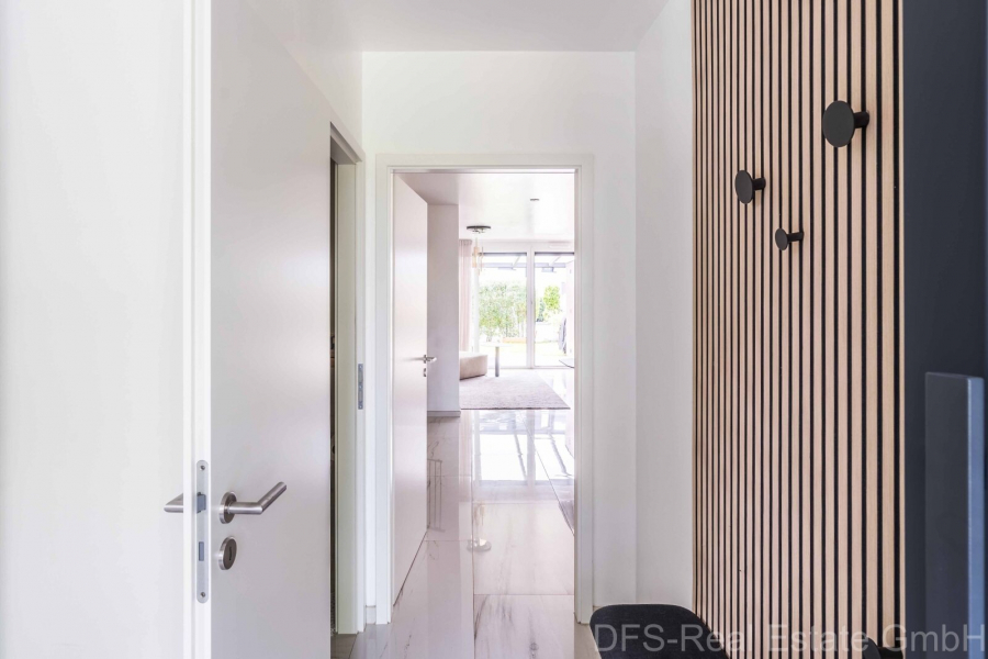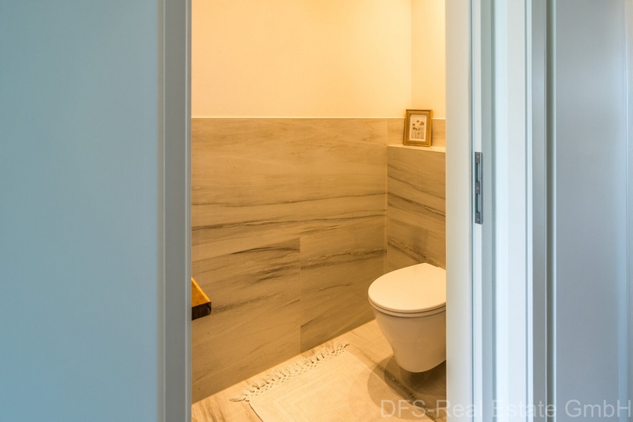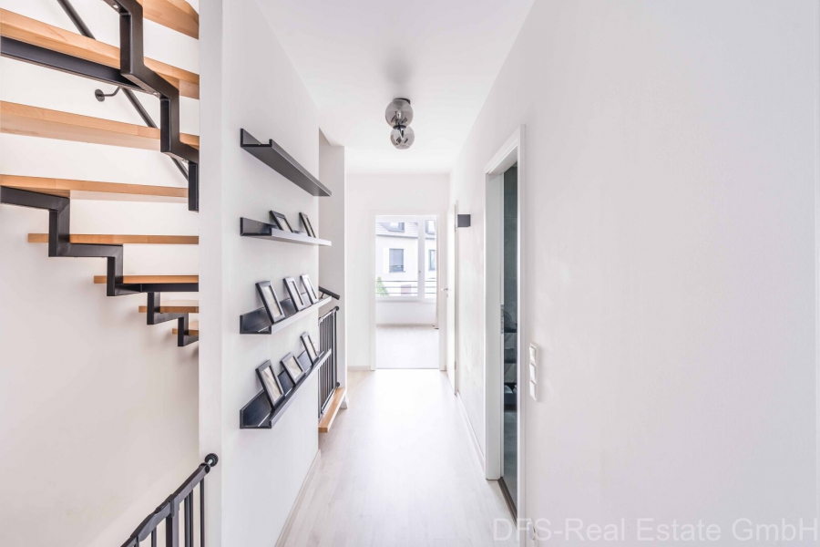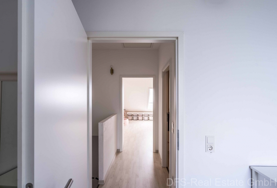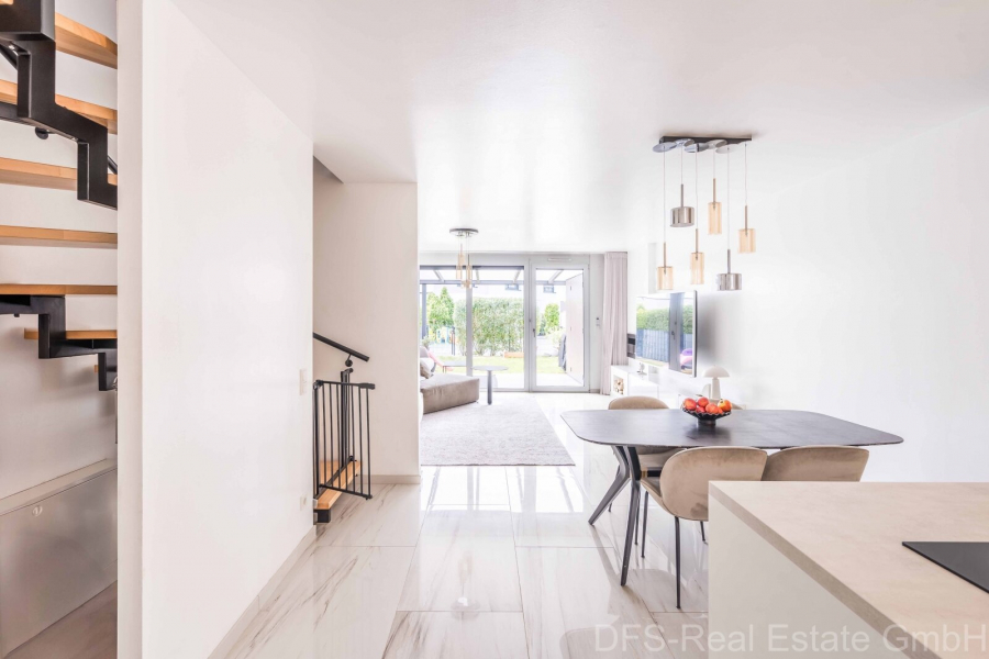 Die gehobene Ausstattung dieses Reihenmittelhauses lässt keine Wünsche offen. Die Böden im gesamten Erdgeschoss sind mit einem modernen Fußbodenheizungssystem ausgestattet, das eine gleichmäßige Wärmeverteilung gewährleistet und für ein behagliches Wohngefühl sorgt. Die Fliesen bestechen mit ihrem großen Format (120cm x 60cm) und ihrer Hochglanzoptik. Die Einbauküche (EBK) ist ein weiteres Highlight mit ihren hochwertigen Geräten und dem Bora Induktions-Kochfeld mit integrierter Dunstabzugshaube. Das Gäste-WC hebt sich durch ein ausgefallenes Waschbecken auf einer Platte in Baumholzoptik hervor. Im Wohnbereich befindet sich ein moderner Brennethanol betriebener Kamin. Die Terrasse ist ebenfalls gefliest und wird mit einer großzügigen lichtdurchfluteten Pergola überdacht. Auf der Terrasse befindet sich ein praktischer Terrassenschrank mit viel Stauraum. Im Obergeschoss und Dachgeschoss sind alle Böden mit einem hochwertigen Laminat ausgestattet - sie sind pflegeleicht und bieten eine ansprechende Optik. Das Badezimmer im Obergeschoss ist ebenso ein Highlight mit seinen modernen Badobjekten und der abgemauerten begehbaren Dusche. Es ist mit hochwertigen Fliesen (60cm x 60cm) in Betonsteinoptik raumhoch gefliest. Die beiden hellen Zimmer im Obergeschoss haben jeweils fast bodentiefe Fenster mit Außengeländern. Daneben befinden sich im Obergeschoss ein praktischer Abstellraum und eine gegenüberliegende Abstellnische. Im Dachgeschoss ist ein großzügiger Hauswirtschaftsraum, der aktuell mit einer Waschmaschine und einem Trockner genutzt wird. Die Anschlüsse für ein optionales Bad sind vorbereitet. Die beiden Zimmer im Dachgeschoss sind einmal mit Gaube und Dachflächenfenster ausgestattet. Die Decken sind im Bereich vom Giebel abgehängt und mit Deckenspots versehen. Darüber befindet sich ein praktischer Stauraum, der über eine ausziehbare Leiter begehbar ist.