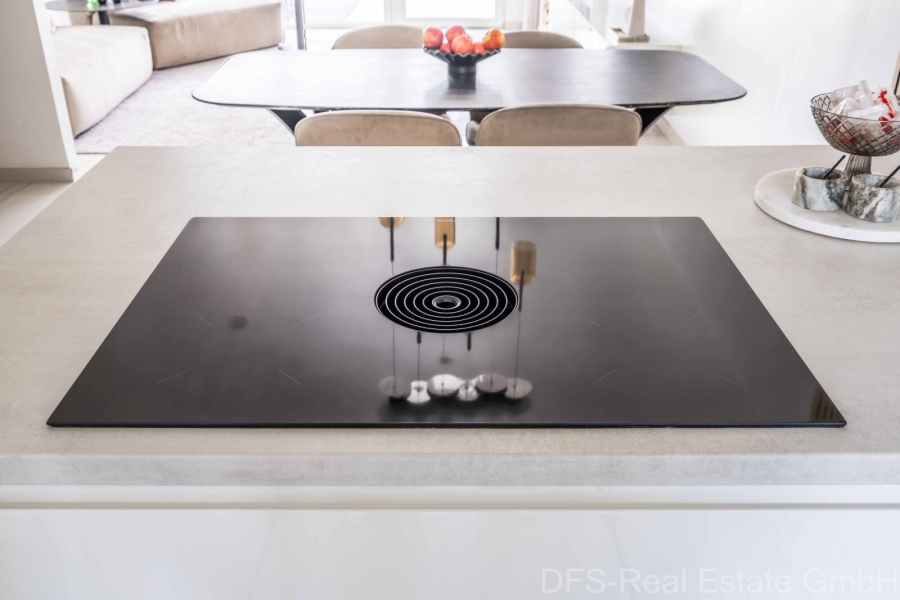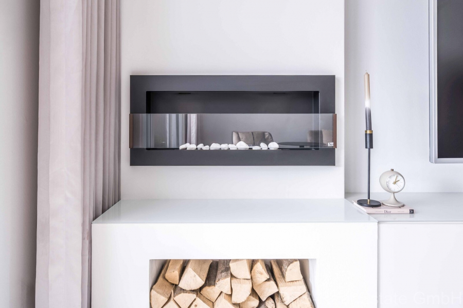 Im gesamten EG sorgt eine Fußbodenheizung für behagliche Wärme. Der einladende mit Brennethanol betriebene Kamin spendet nicht nur etwas Wärme, sondern auch ein gemütliches Ambiente. Die hochwertigen Bodenbeläge aus hochglänzenden Fliesen (120cm x 60 cm) vereinen Funktionalität und Ästhetik, sind pflegeleicht und tragen zu einem angenehmen Raumklima bei. Die Wände und Decken sind mit Malerflies weiß gehalten. Im Obergeschoss und Dachgeschoss sind die Böden mit hochwertigem Laminat ausgelegt und die Zimmer werden mit herkömmlichen Heizkörpern beheizt. Das Blockheizkraftwerk versorgt die Wohnanlage mit umweltfreundlicher Energie nach den Kriterien im Niedrigenergie-Standard sowie KFW55 Effizienzhaus-Standard.